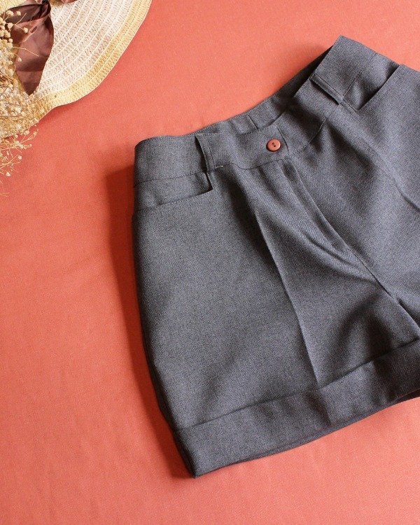 Textil gabardina de poliester / Color base gris azulado / Acceso por cruce de cartera con botón / Cintura plana / 2 bolsillos delanteros en laterales de prenda / Presillas para pasar cinto / Pinzas de entalle / Ruedo con bota